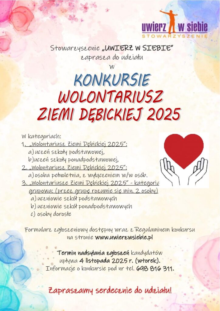 Stowarzyszenie „Uwierz w siebie” organizuje konkurs „Wolontariusz Ziemi Dębickiej 2025”. Jego celem jest m.in. promocja wolontariatu dębickiego w mieście i regionie, wskazanie różnych form pracy wolontarystycznej, podziękowania wolontariuszom za ich pracę i zaangażowanie w działalność na rzecz środowiska lokalnego.